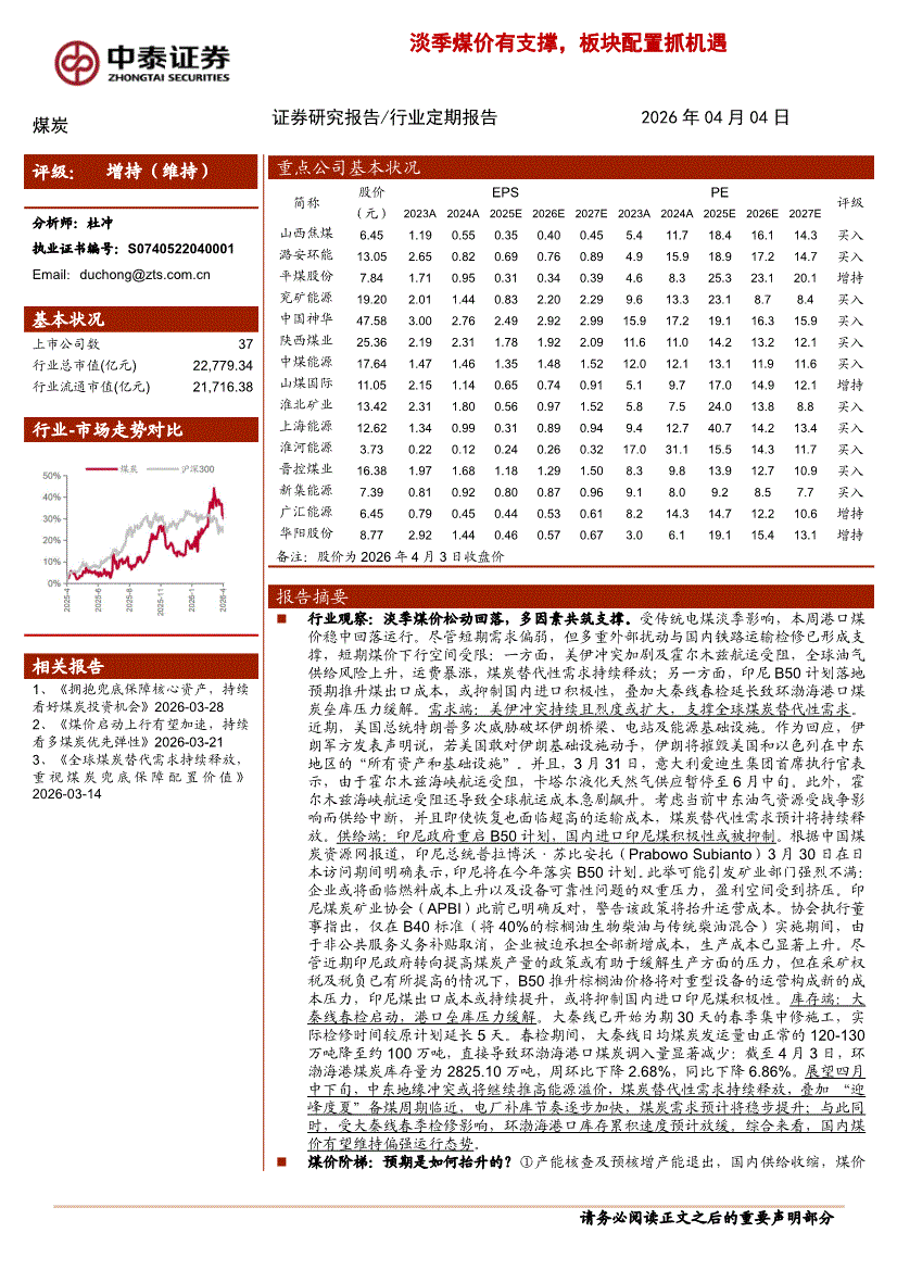 煤炭行业:中泰证券-煤炭行业:淡季煤价有支撑,板块配置抓机遇-260404