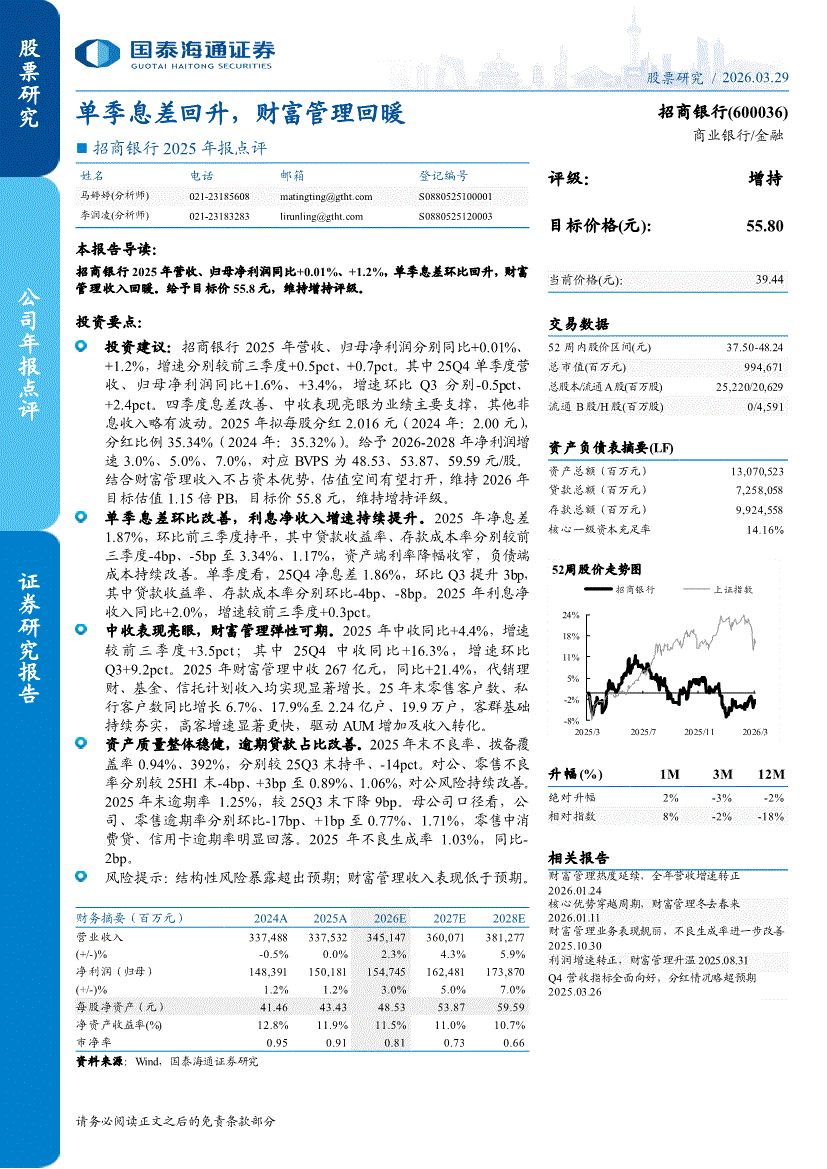 招商银行:国泰海通证券-招商银行-600036-2025年报点评:单季息差回升,财富管理回暖-260329