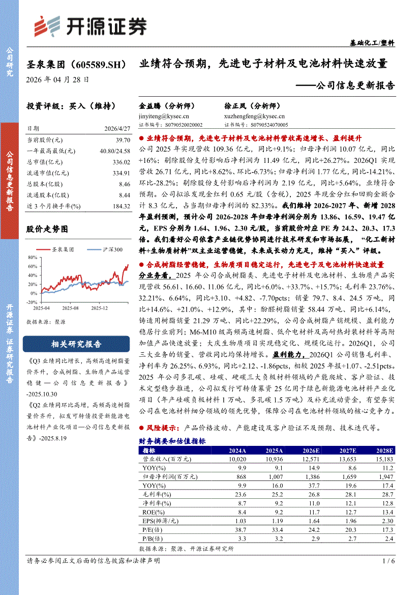 圣泉集团:开源证券-圣泉集团-605589-公司信息更新报告:业绩符合预期,先进电子材料及电池材料快速放量-260428