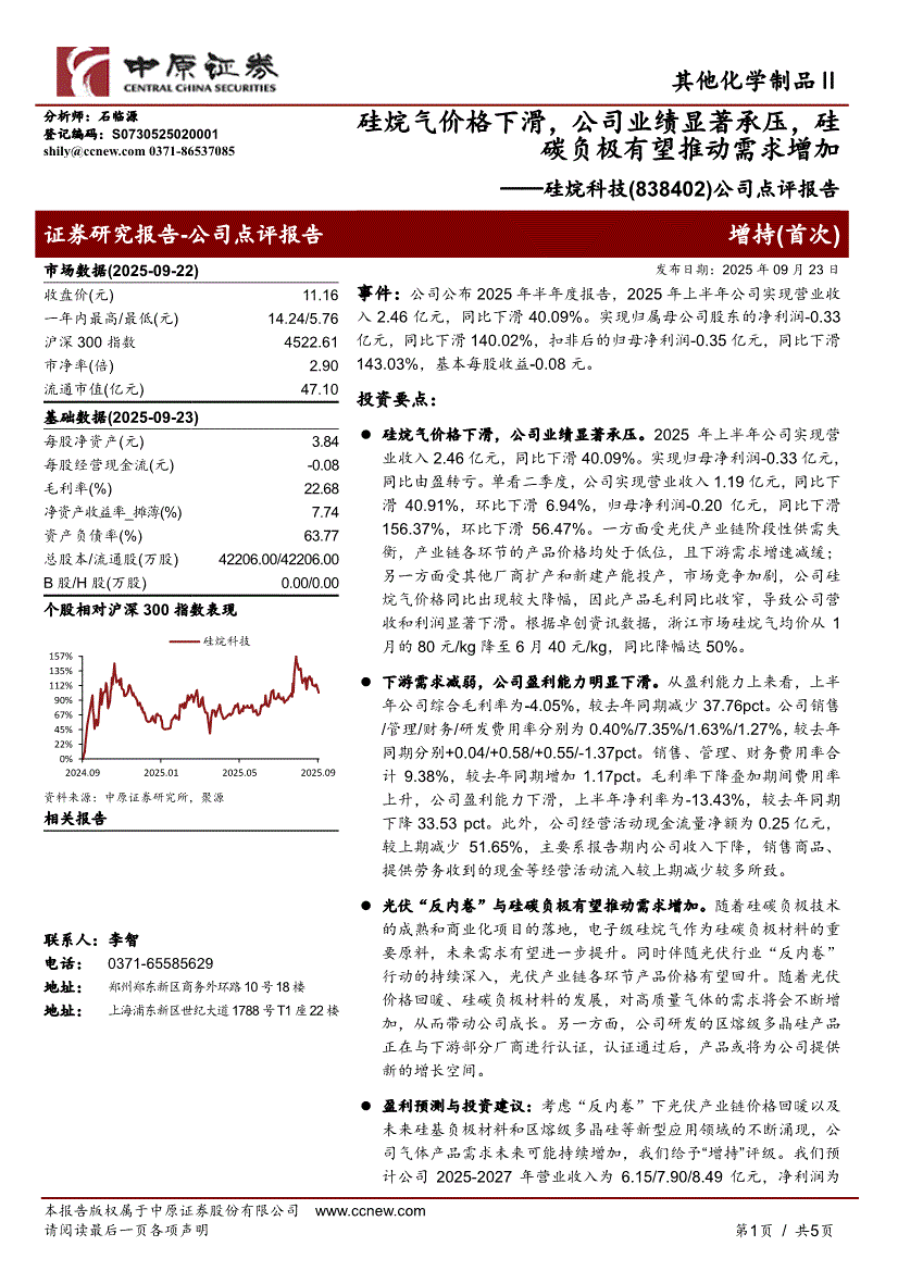 硅烷科技:中原证券-硅烷科技-920402-公司点评报告:硅烷气价格下滑,公司业绩显著承压,硅碳负极有望推动需求增加-250923
