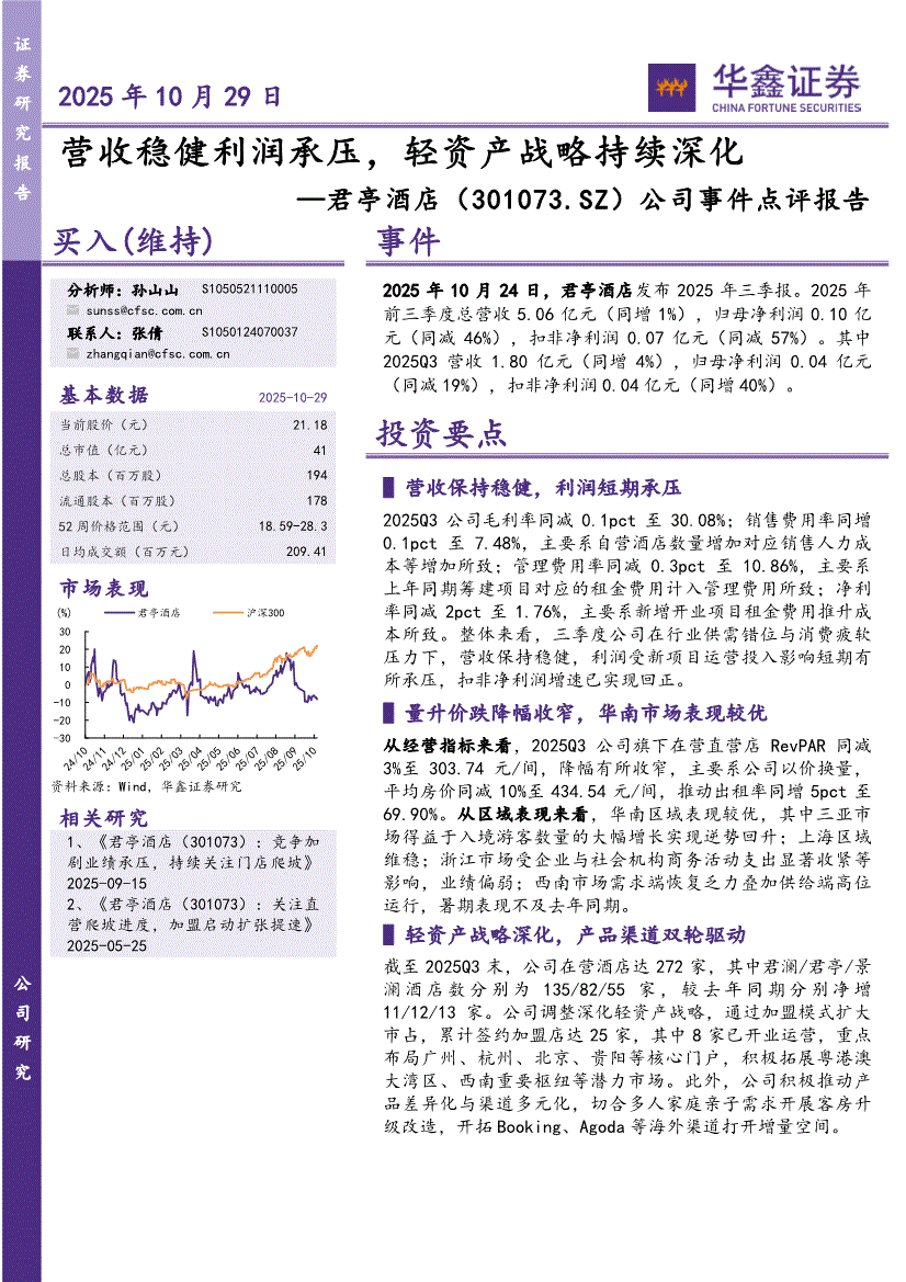 君亭酒店:华鑫证券-君亭酒店-301073-公司事件点评报告:营收稳健利润承压,轻资产战略持续深化-251029