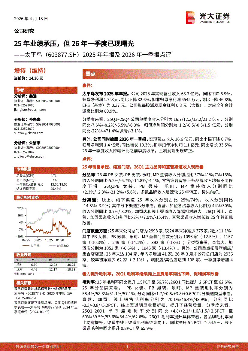 光大证券-太平鸟-603877-2025年年报及2026年一季报点评:25年业绩承压,但26年一季度已现曙光-260418