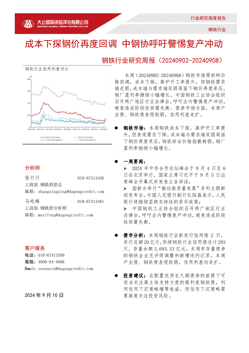 钢铁行业:大公国际-钢铁行业研究周报:成本下探钢价再度回调,中钢协呼吁警惕复产冲动-240910