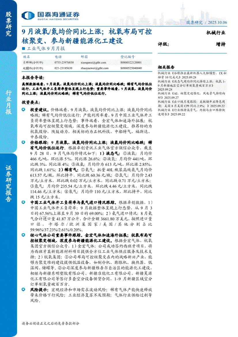 机械行业:国泰海通证券-机械行业工业气体9月月报:9月液氧/氮均价同比上涨;杭氧布局可控核聚变、参与新疆能源化工建设-251006