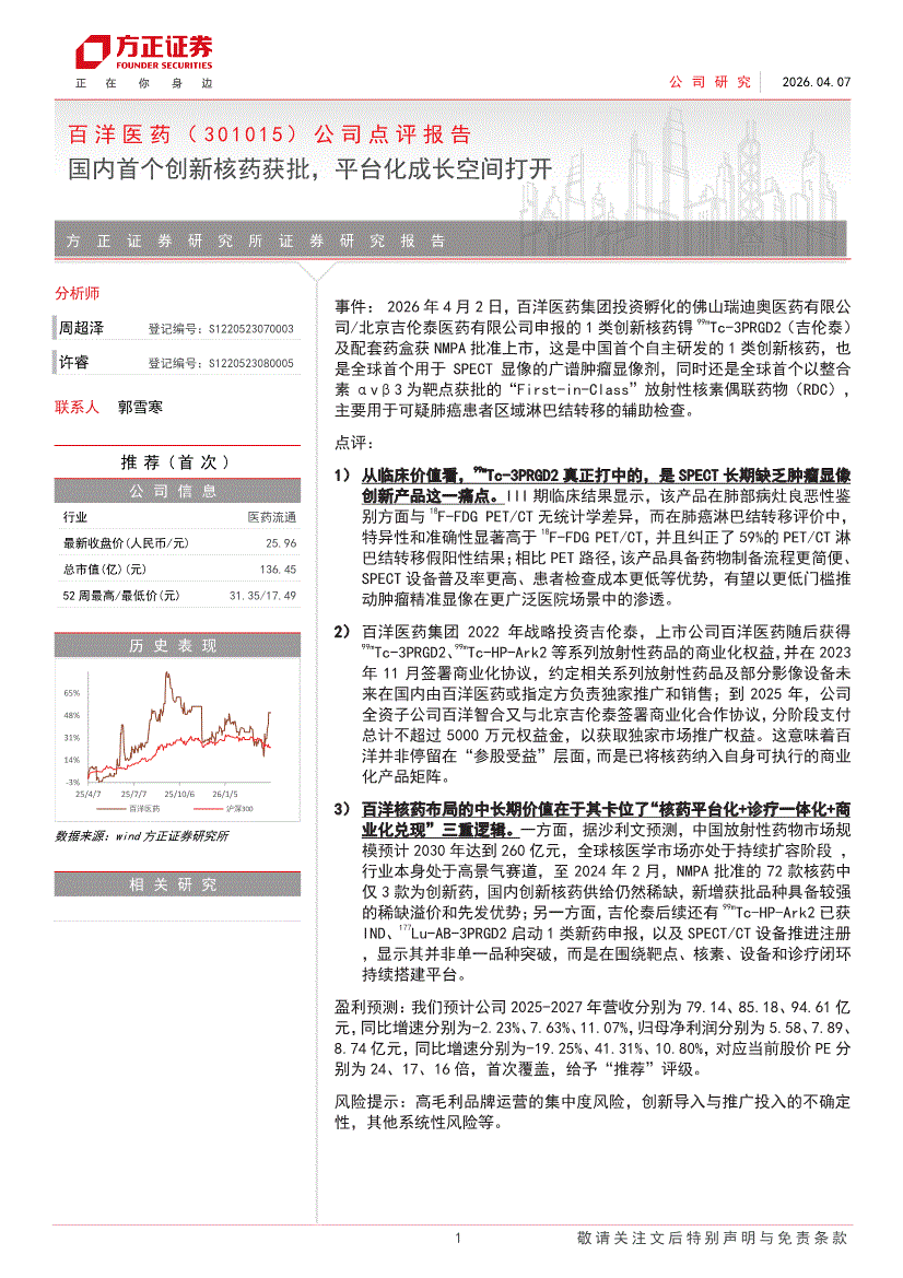 百洋医药:方正证券-百洋医药-301015-公司点评报告:国内首个创新核药获批,平台化成长空间打开-260407