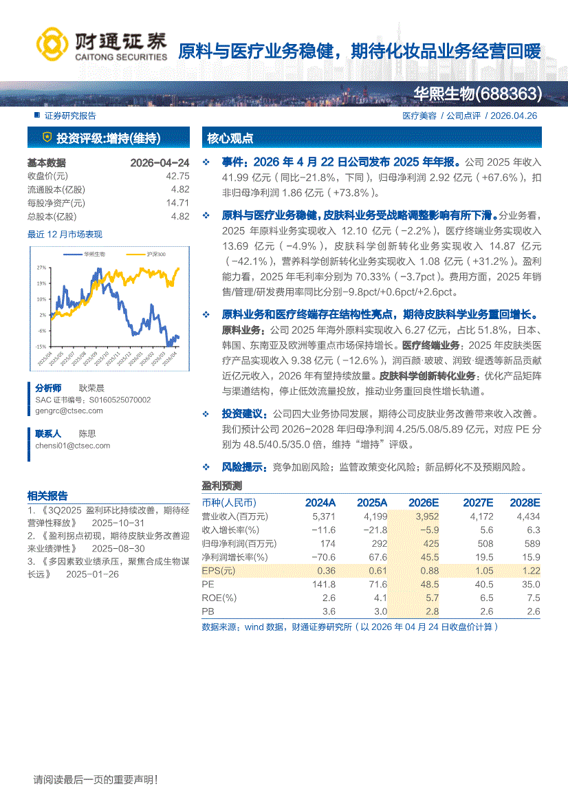 华熙生物:财通证券-华熙生物-688363-原料与医疗业务稳健,期待化妆品业务经营回暖-260426