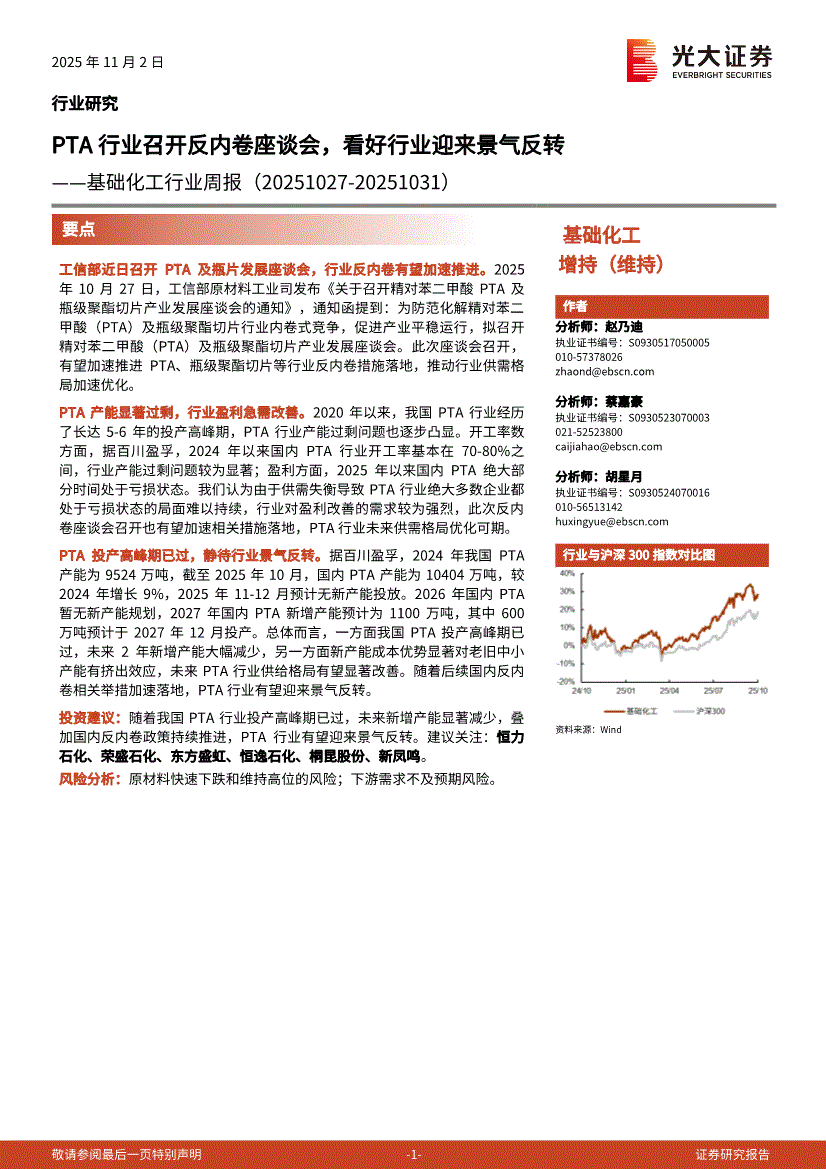 基础化工行业:光大证券-基础化工行业周报:PTA行业召开反内卷座谈会,看好行业迎来景气反转-251102