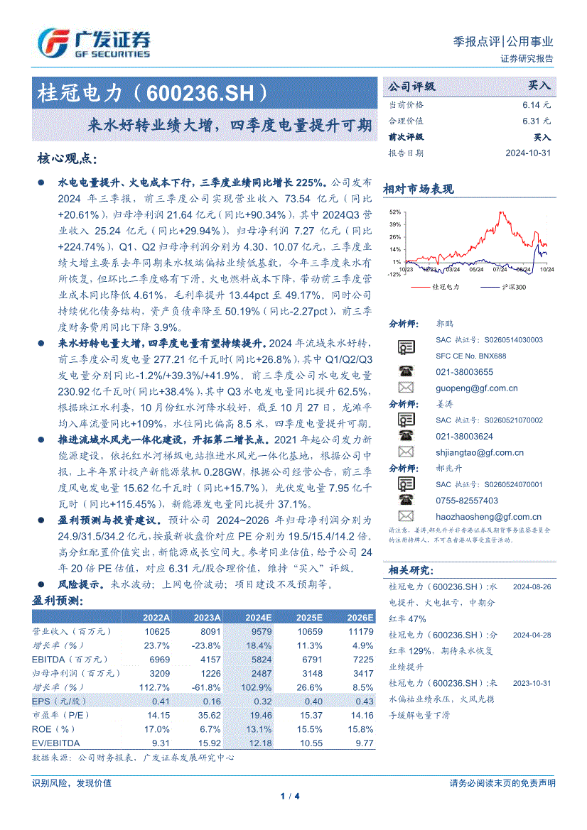 桂冠电力:广发证券-桂冠电力-600236-来水好转业绩大增,四季度电量提升可期-241031