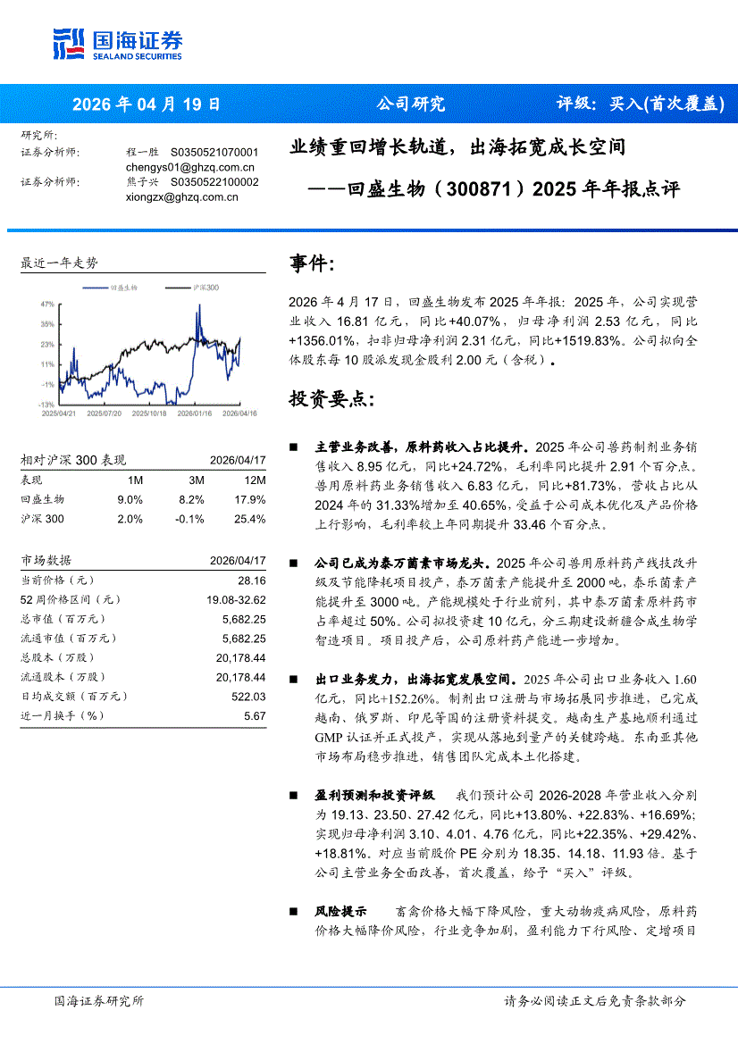 回盛生物:国海证券-回盛生物-300871-2025年年报点评:业绩重回增长轨道,出海拓宽成长空间-260419