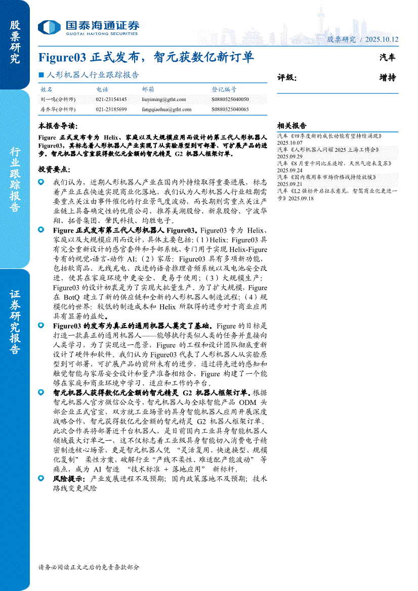 人形机器人行业:国泰海通证券-人形机器人行业跟踪报告:Figure03正式发布,智元获数亿新订单-251012