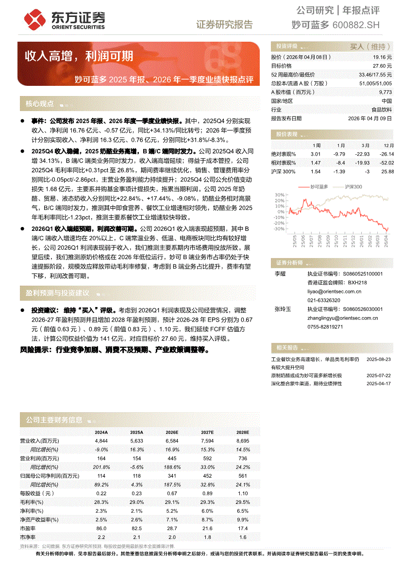 妙可蓝多:东方证券-妙可蓝多-600882-2025年报、2026年一季度业绩快报点评:收入高增,利润可期-260409