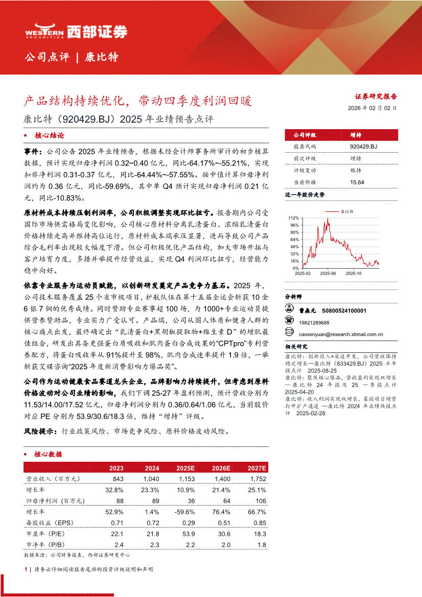 康比特:西部证券-康比特-920429-2025年业绩预告点评:产品结构持续优化,带动四季度利润回暖-260202