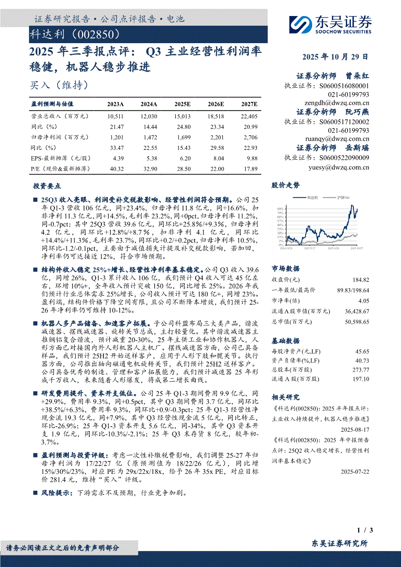 科达利:东吴证券-科达利-002850-2025年三季报点评: Q3主业经营性利润率稳健,机器人稳步推进-251029