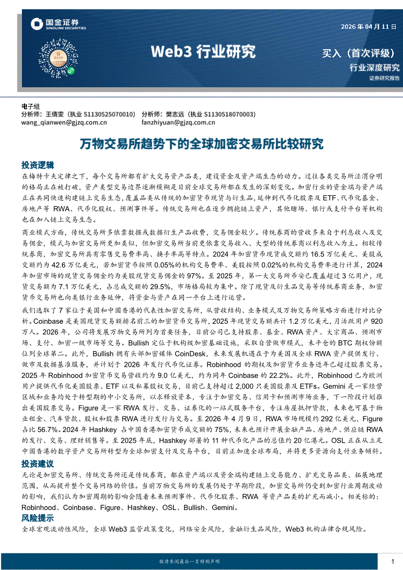 Web3行业:国金证券-Web3行业研究:万物交易所趋势下的全球加密交易所比较研究-260411