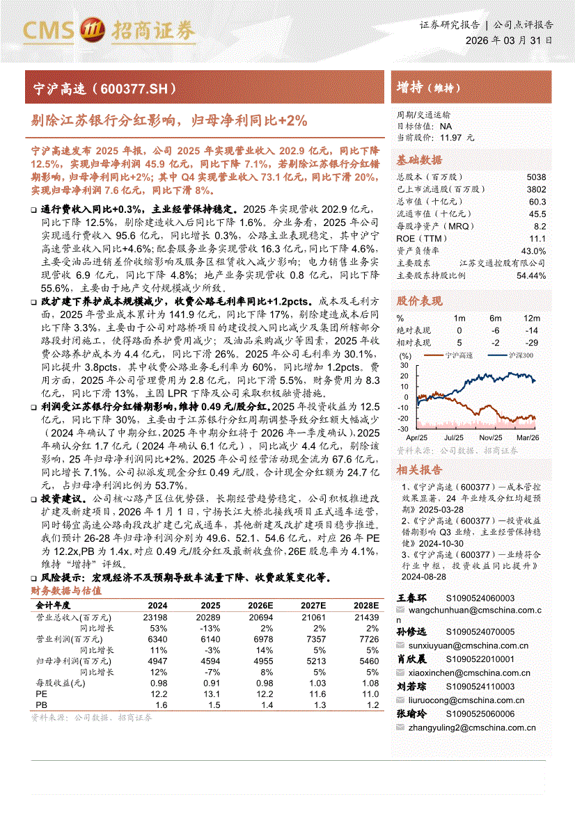 宁沪高速:招商证券-宁沪高速-600377-剔除江苏银行分红影响,归母净利同比+2%-260331