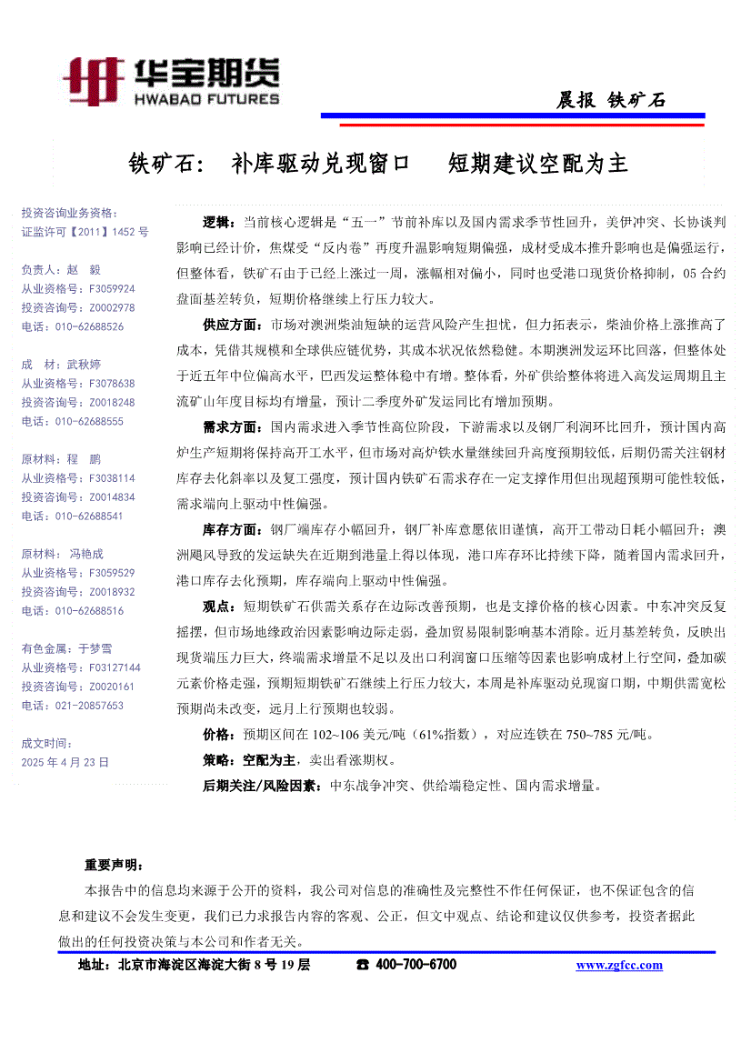 华宝期货-铁矿石晨报:补库驱动兑现窗口,短期建议空配为主-260423