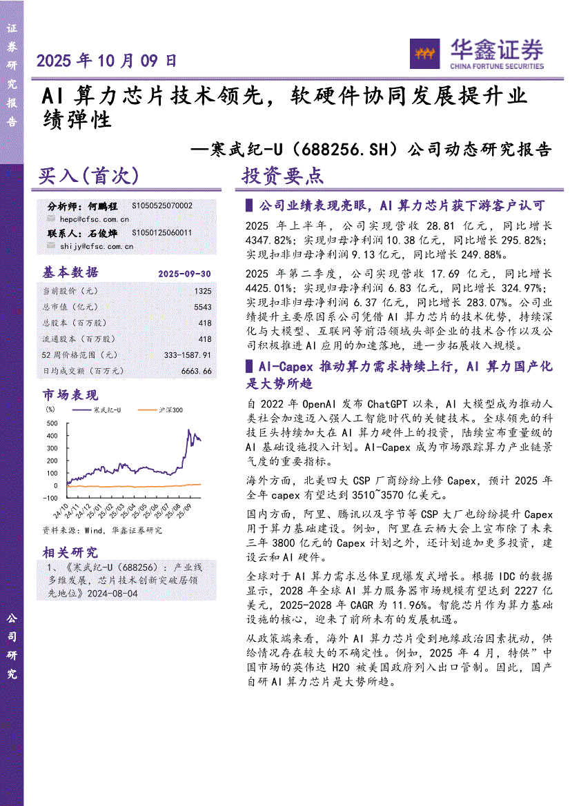 寒武纪:华鑫证券-寒武纪-688256-公司动态研究报告:AI算力芯片技术领先,软硬件协同发展提升业绩弹性-251009