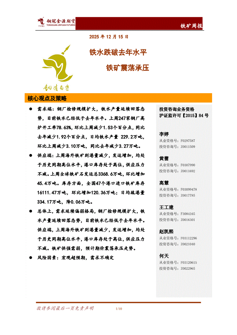 铜冠金源期货-铁矿周报:铁水跌破去年水平,铁矿震荡承压-251215