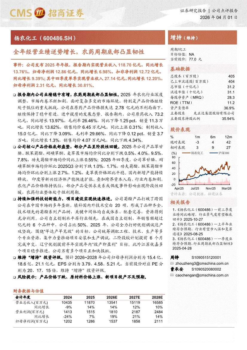 扬农化工:招商证券-扬农化工-600486-全年经营业绩逆势增长,农药周期底部凸显韧性-260401