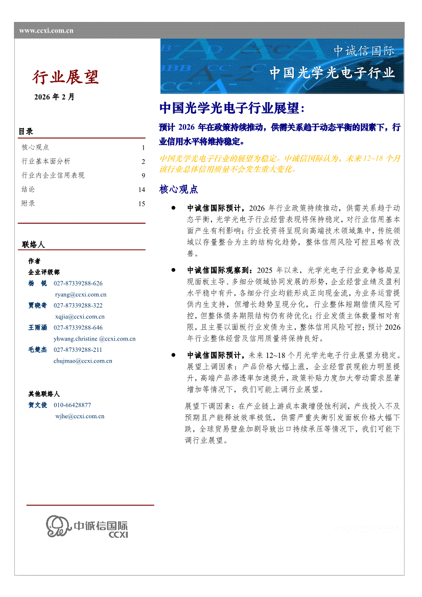 光学光电子行业:中诚信国际-中国光学光电子行业展望:预计2026年在政策持续推动,供需关系趋于动态平衡的因素下,行业信用水平将维持稳定-260209
