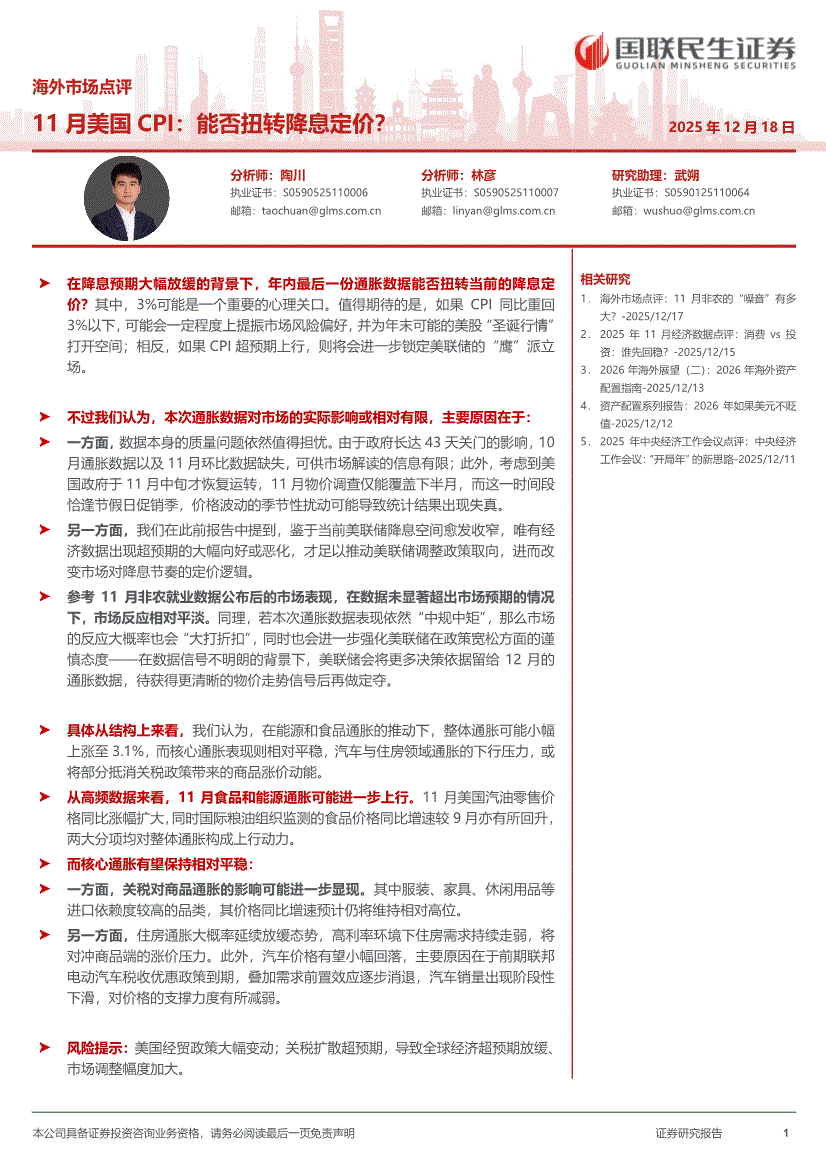 国联民生证券-海外市场点评:11月美国CPI,能否扭转降息定价?-251218