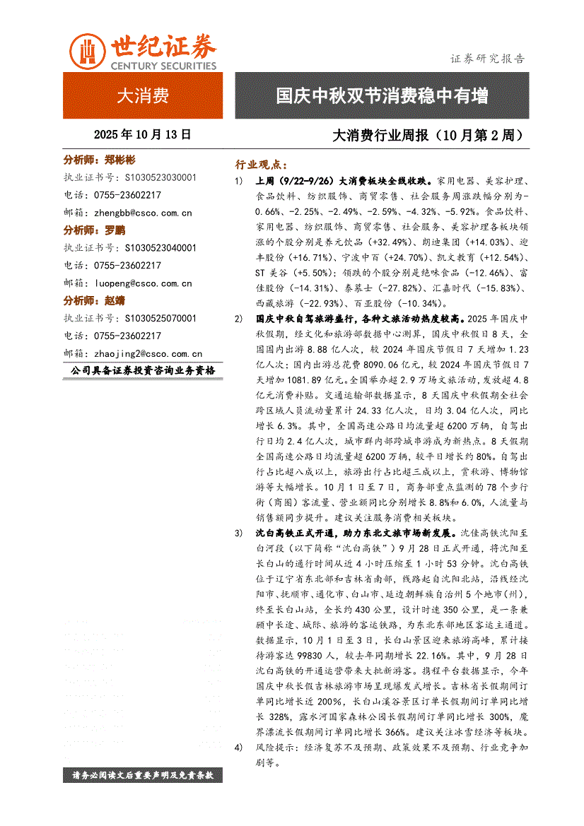 大消费行业:世纪证券-大消费行业周报(10月第2周):国庆中秋双节消费稳中有增-251013