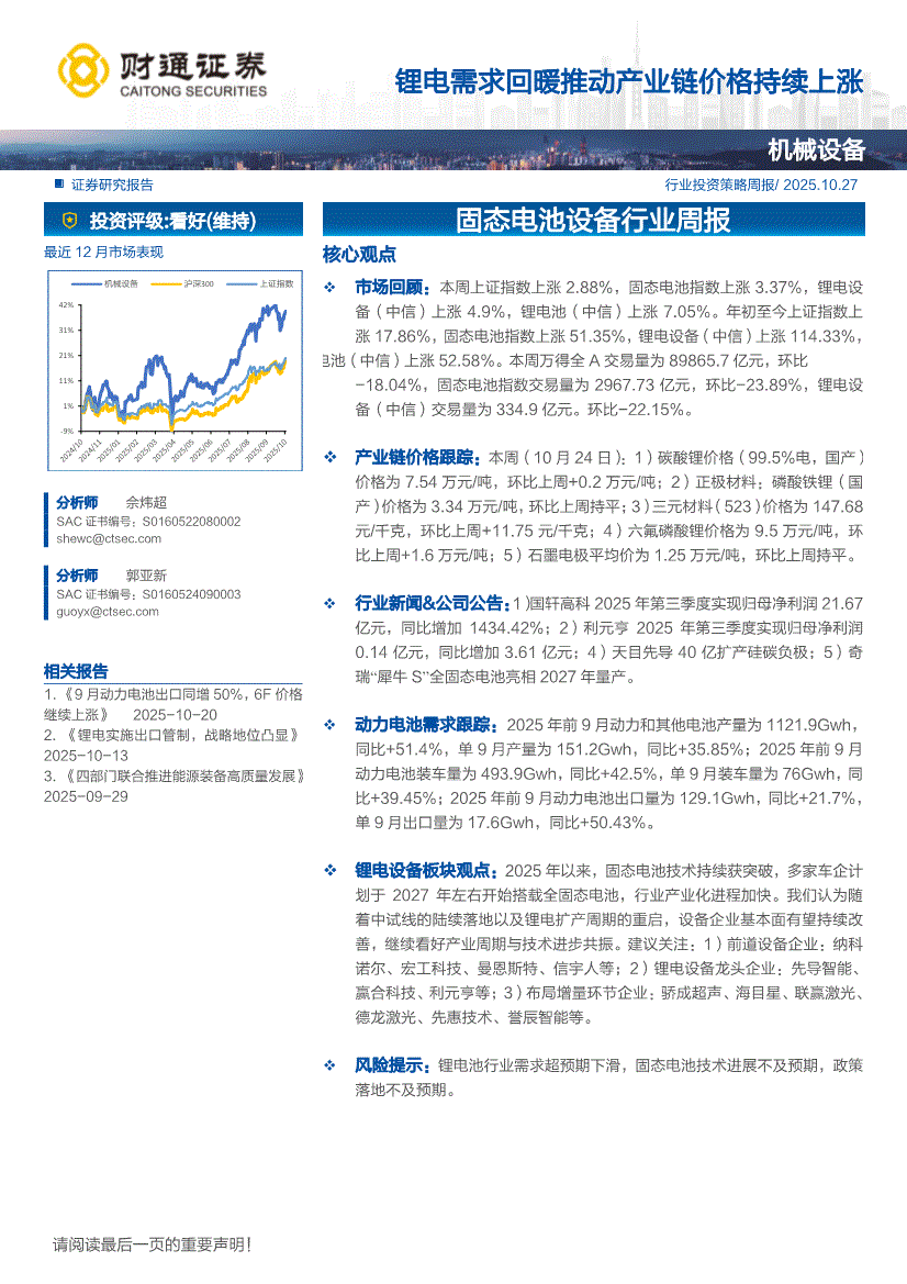 固态电池设备行业:财通证券-固态电池设备行业周报:锂电需求回暖推动产业链价格持续上涨-251027