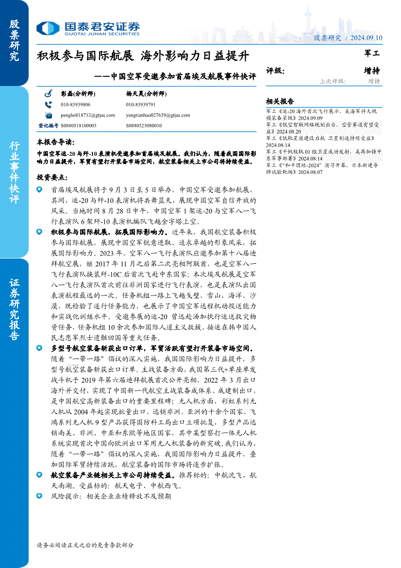 军工行业:国泰君安-军工行业中国空军受邀参加首届埃及航展事件快评:积极参与国际航展,海外影响力日益提升-240910