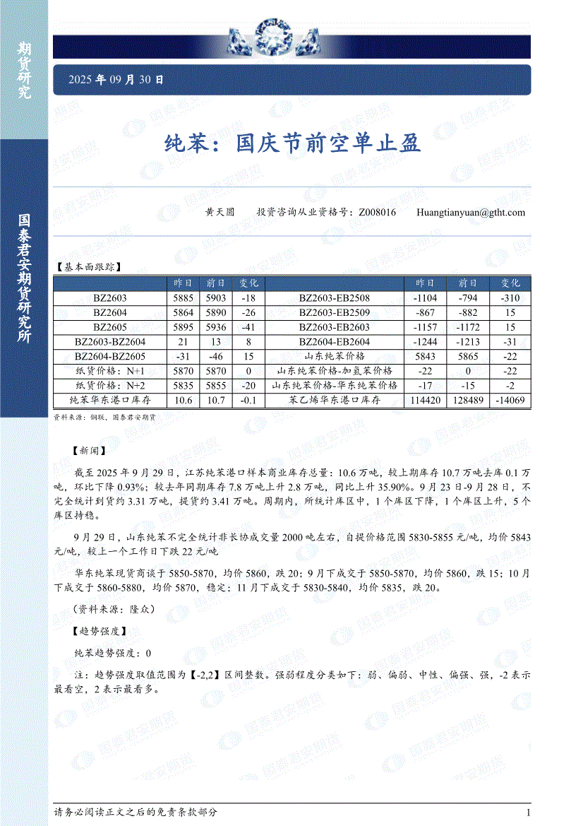 国泰君安期货-纯苯:国庆节前空单止盈-250929