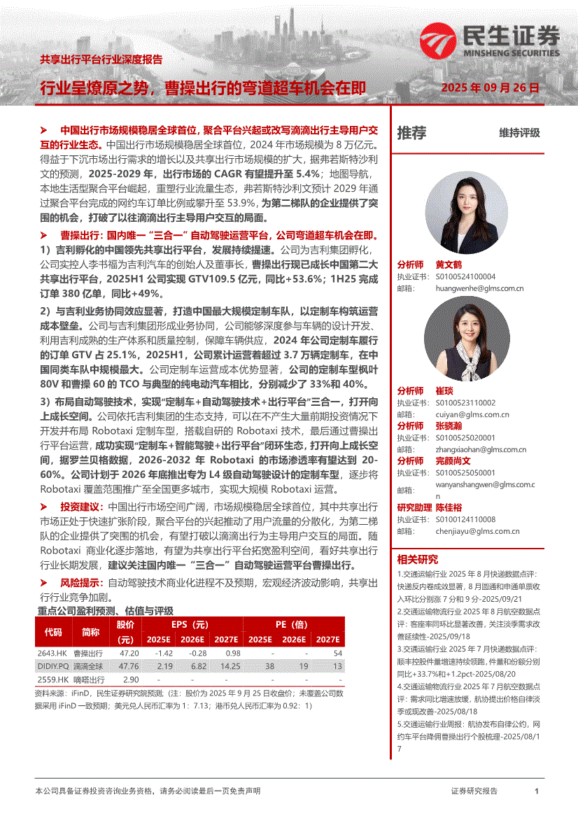交通运输行业:民生证券-共享出行平台行业深度报告:行业呈燎原之势,曹操出行的弯道超车机会在即-250926