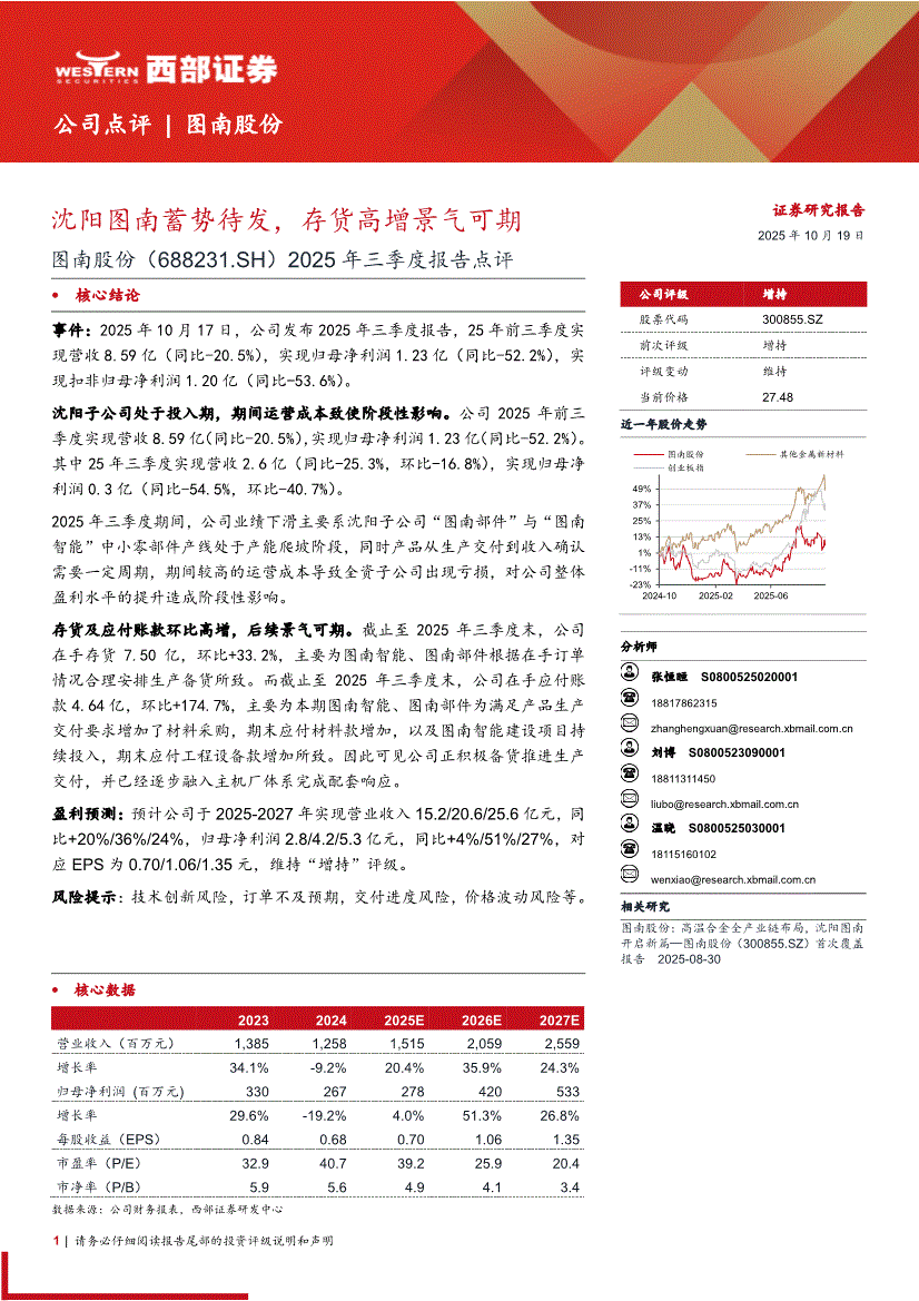 图南股份:西部证券-图南股份-300855-2025年三季度报告点评:沈阳图南蓄势待发,存货高增景气可期-251019