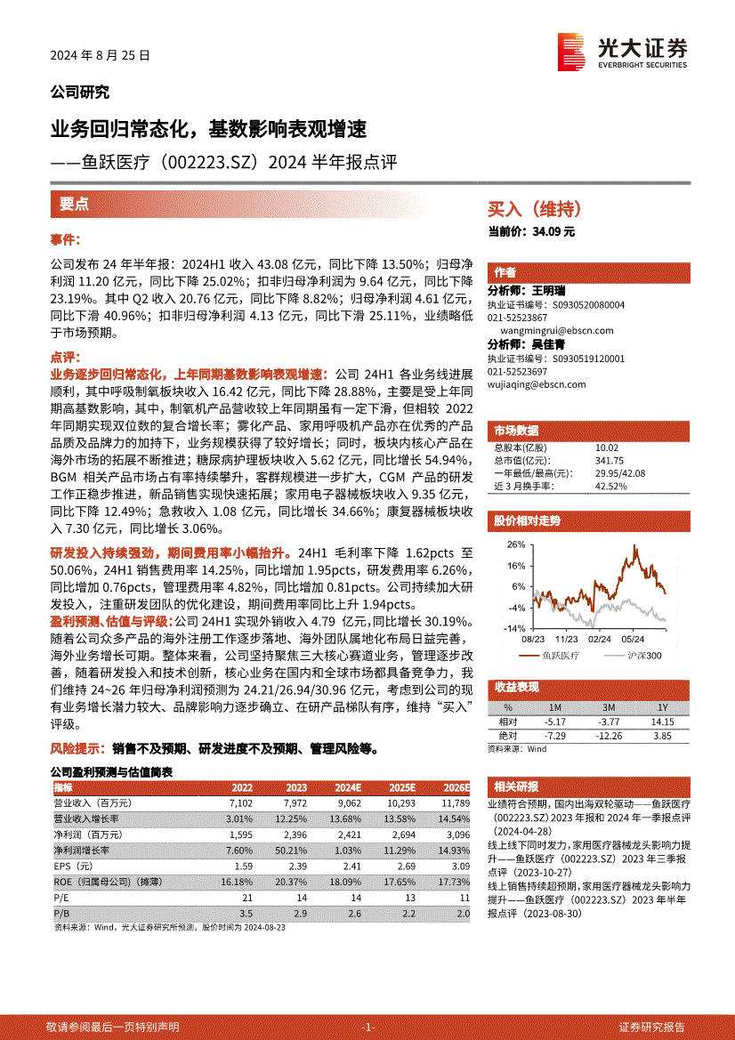 鱼跃医疗:光大证券-鱼跃医疗-002223-2024半年报点评:业务回归常态化,基数影响表观增速-240825