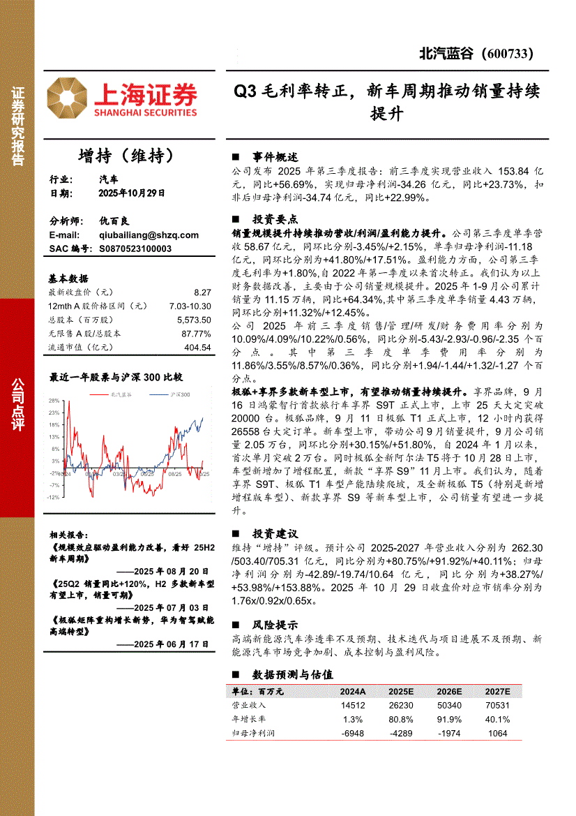 北汽蓝谷:上海证券-北汽蓝谷-600733-Q3毛利率转正,新车周期推动销量持续提升-251029