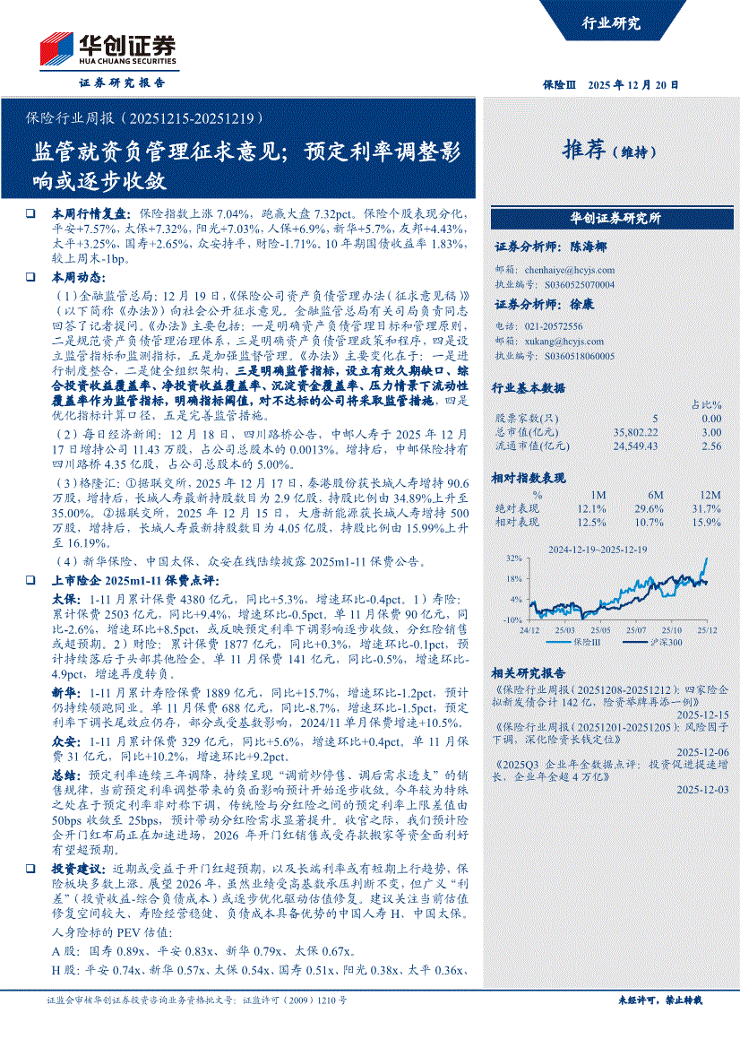 保险行业:华创证券-保险行业周报:监管就资负管理征求意见;预定利率调整影响或逐步收敛-251220