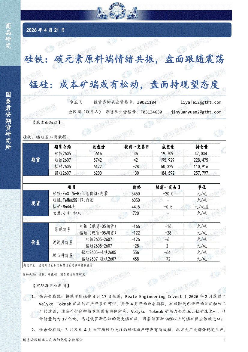 国泰君安期货-硅铁:碳元素原料端情绪共振,盘面跟随震荡,锰硅,成本矿端或有松动,盘面持观望态度-260421
