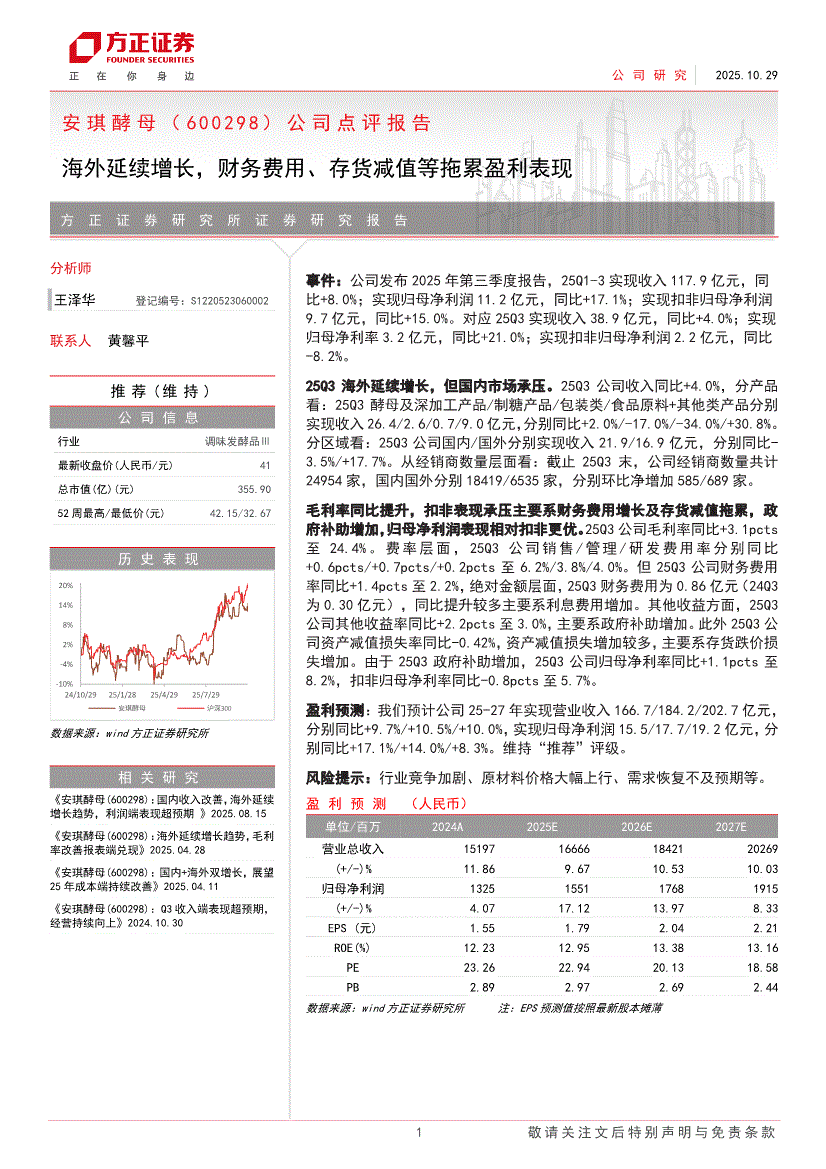 安琪酵母:方正证券-安琪酵母-600298-公司点评报告:海外延续增长,财务费用、存货减值等拖累盈利表现-251029