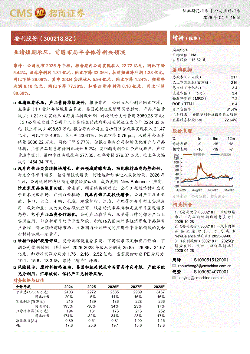 招商证券-安利股份-300218-绩短期承压,前瞻布局半导体等新兴领域-260415