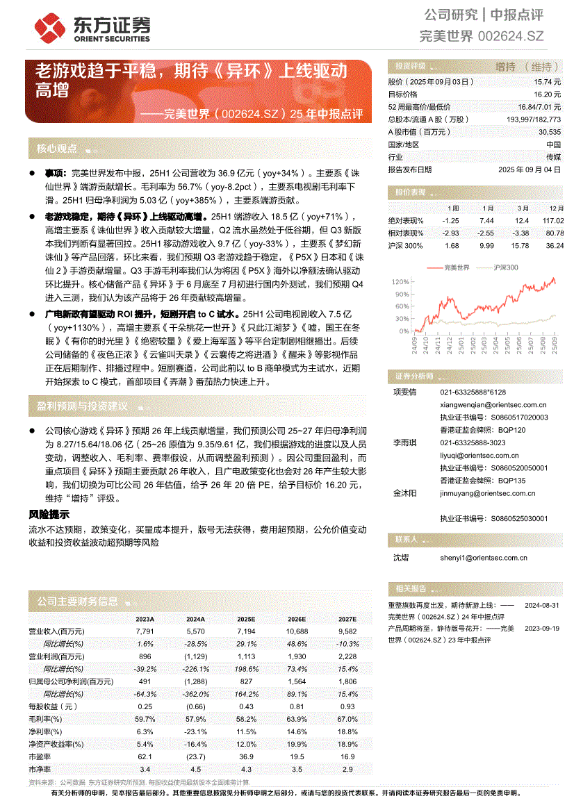 完美世界:东方证券-完美世界-002624-25年中报点评:老游戏趋于平稳,期待《异环》上线驱动高增-250904