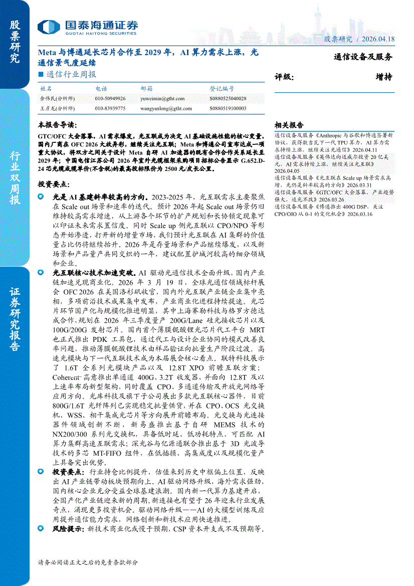 通信行业:国泰海通证券-通信行业周报:Meta与博通延长芯片合作至2029年,AI算力需求上涨,光通信景气度延续-260418