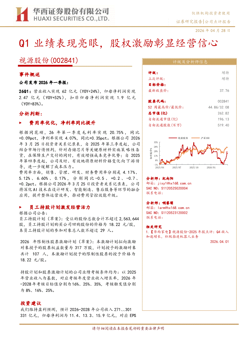 视源股份:华西证券-视源股份-002841-Q1业绩表现亮眼,股权激励彰显经营信心-260428