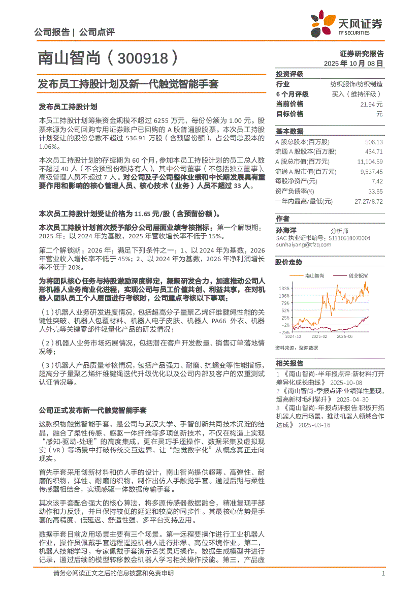 南山智尚:天风证券-南山智尚-300918-发布员工持股计划及新一代触觉智能手套-251008