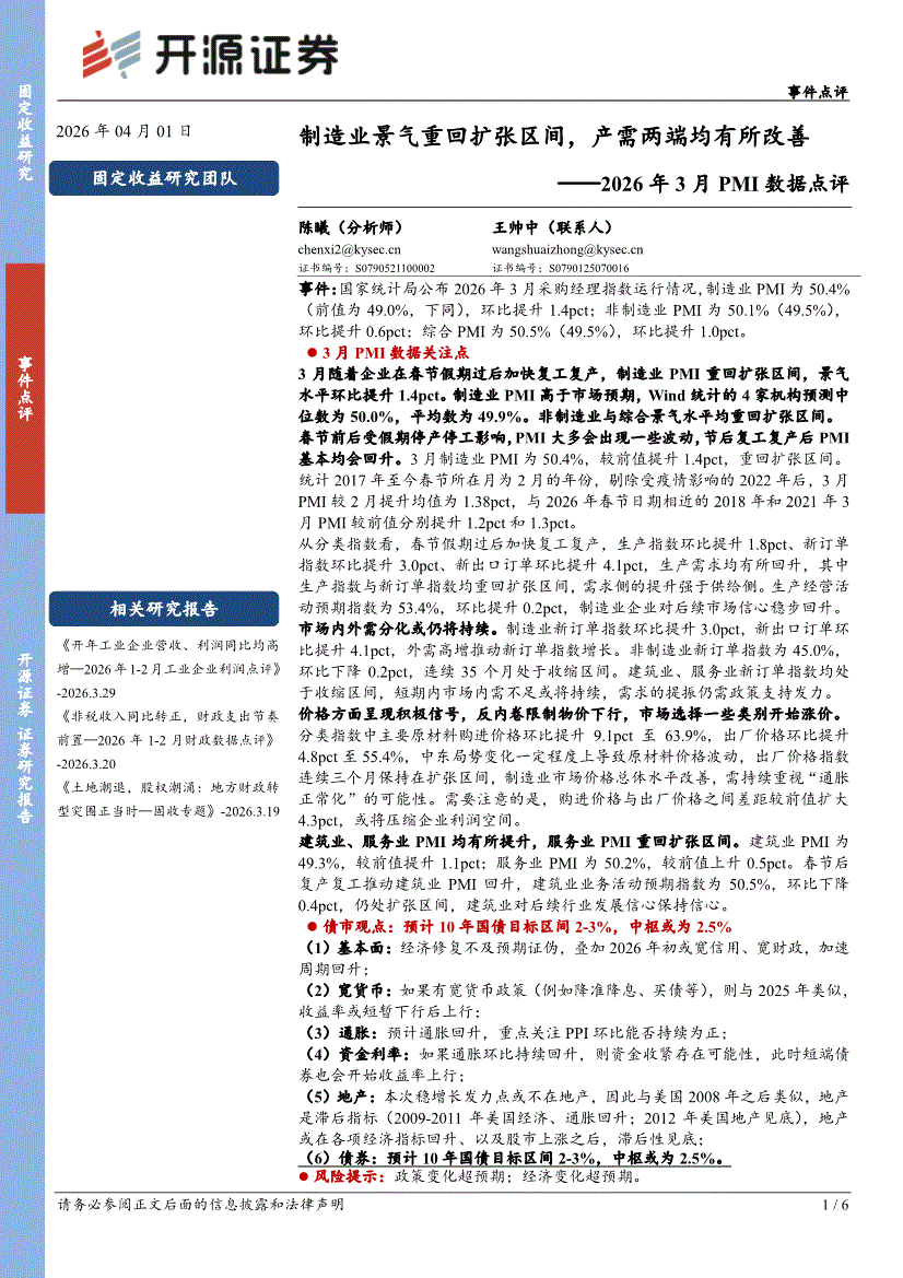 开源证券-2026年3月PMI数据点评:制造业景气重回扩张区间,产需两端均有所改善-260401