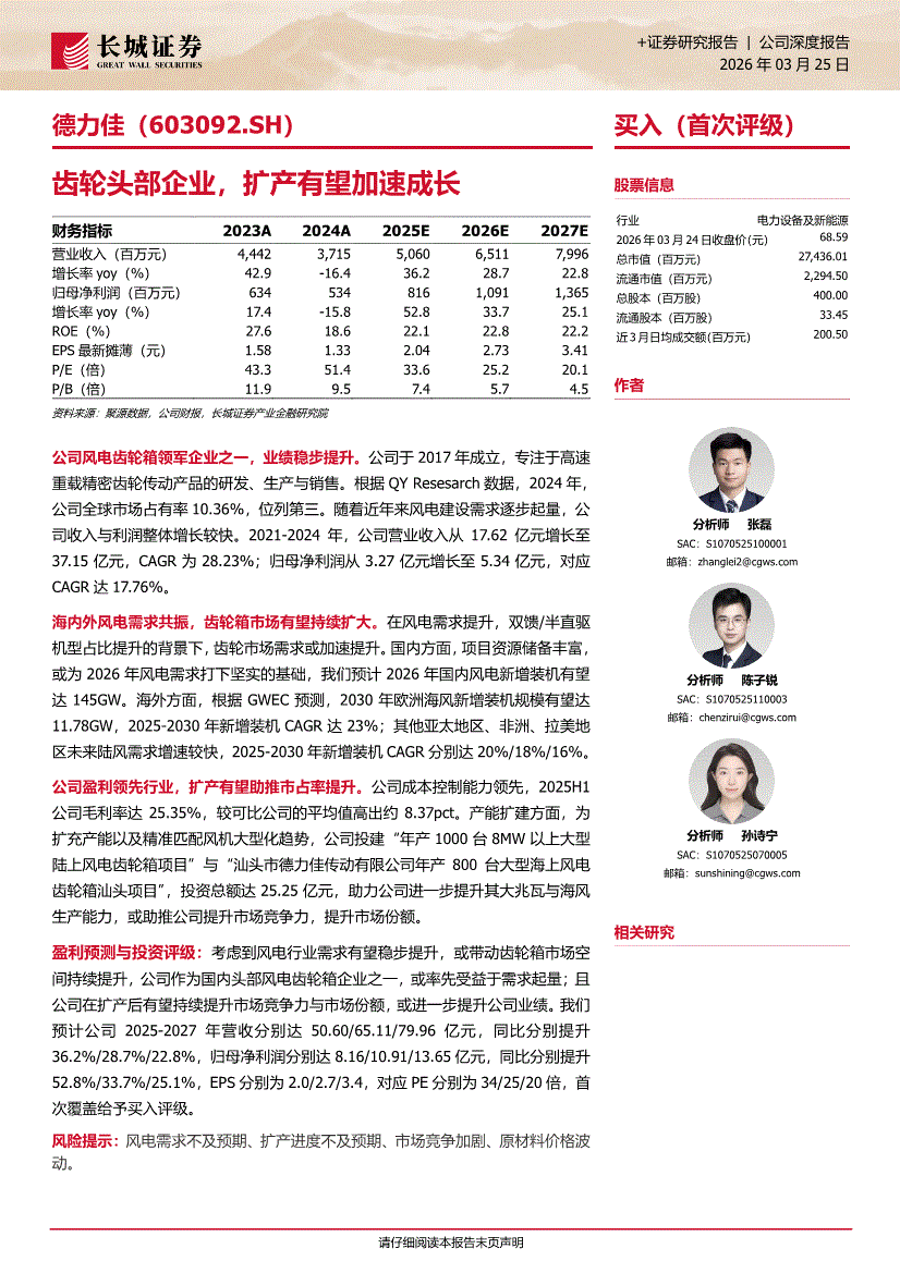 德力佳:长城证券-德力佳-603092-齿轮头部企业,扩产有望加速成长-260325