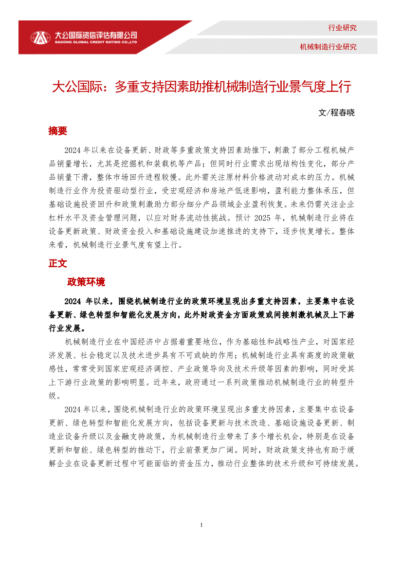机械制造行业:大公国际-机械制造行业:多重支持因素助推机械制造行业景气度上行-241217