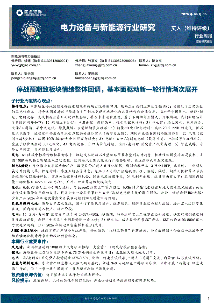 电力设备与新能源行业:国金证券-电力设备与新能源行业周报:停战预期致板块情绪整体回调,基本面驱动新一轮行情渐次展开-260406