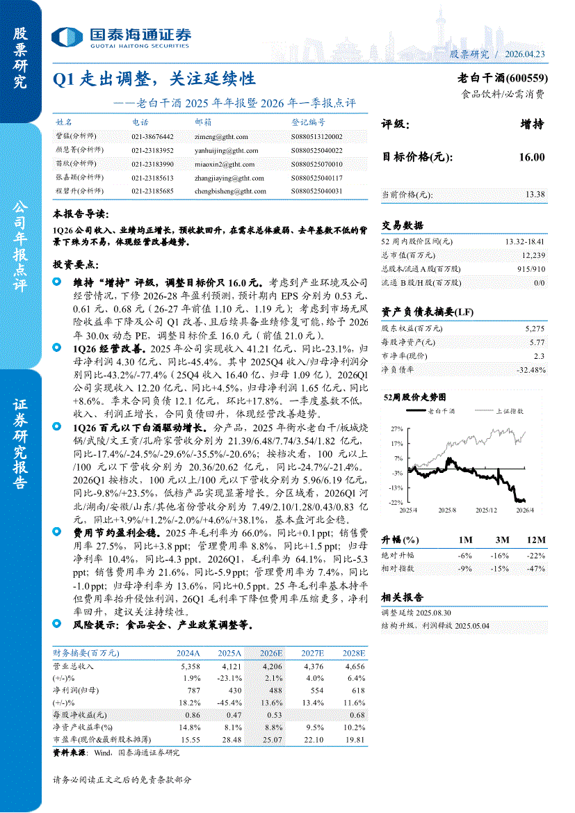 老白干酒:国泰海通证券-老白干酒-600559-老白干酒2025年年报暨2026年一季报点评:Q1走出调整,关注延续性-260423