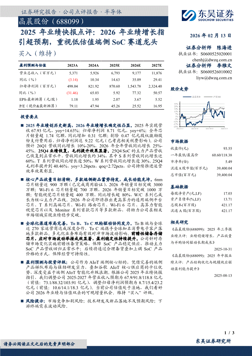 晶晨股份:东吴证券-晶晨股份-688099-2025年业绩快报点评:2026年业绩增长指引超预期,重视低估值端侧SoC赛道龙头-260213