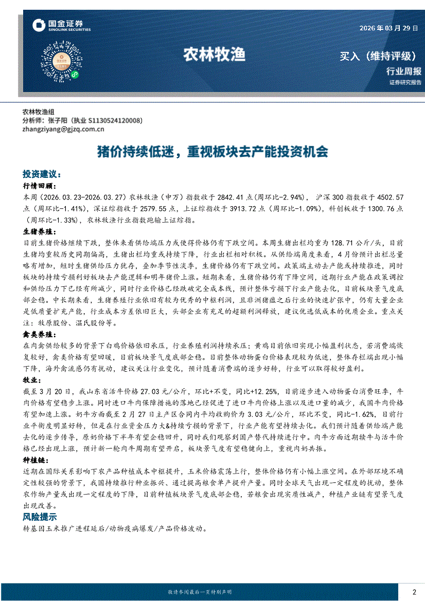 农林牧渔行业:国金证券-农林牧渔行业周报:猪价持续低迷,重视板块去产能投资机会-260329