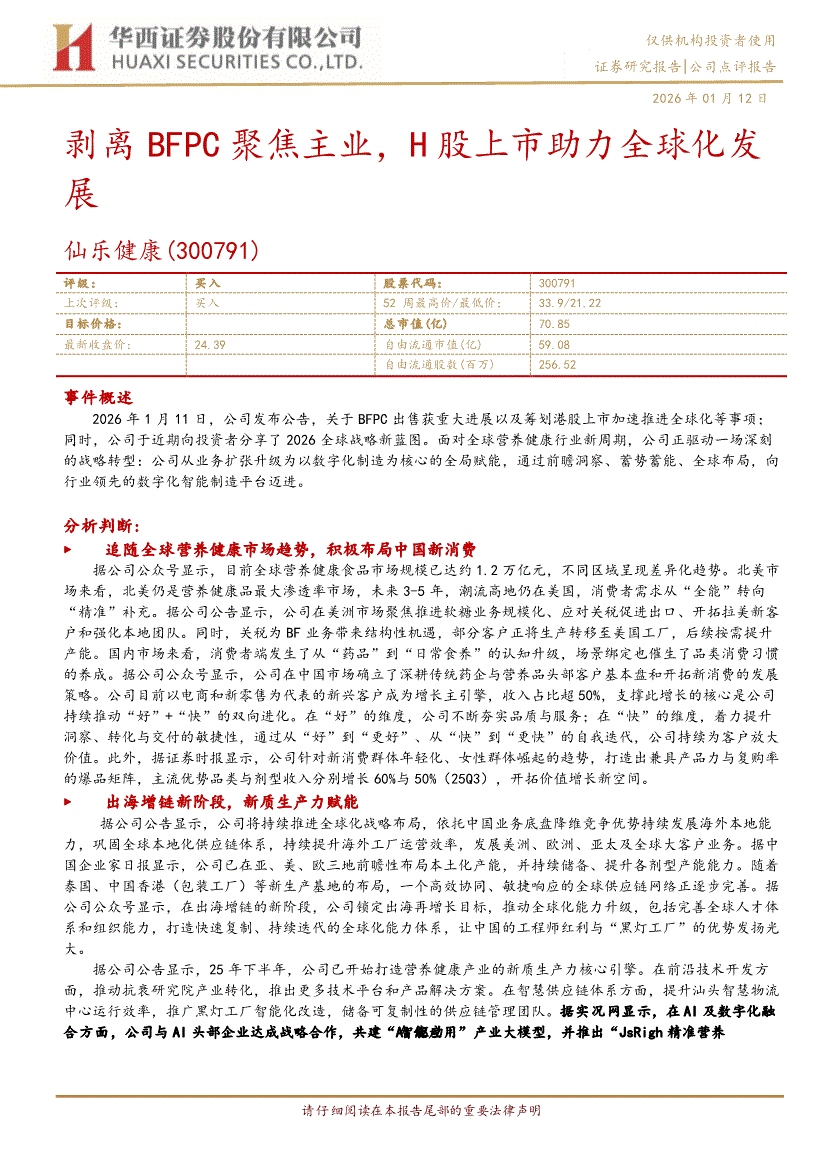 仙乐健康:华西证券-仙乐健康-300791-剥离BFPC聚焦主业,H股上市助力全球化发展-260112