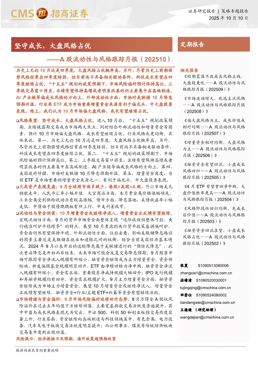 招商证券-A股流动性与风格跟踪月报:坚守成长,大盘风格占优-251010